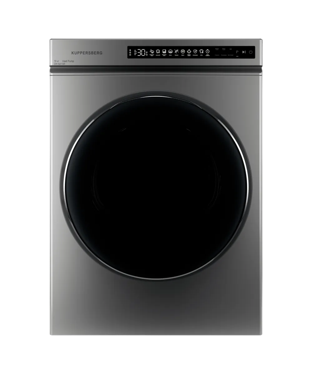Сушильная машина Kuppersberg/ Сушильная машина Kuppersberg, отдельностоящая, глубина 58 см, тепловой насос, 10 кг, 10 программ, отсрочка старта, защита от сминания, ультрафиолет, сенсорное управление, энергоэффективность А+, цвет серый