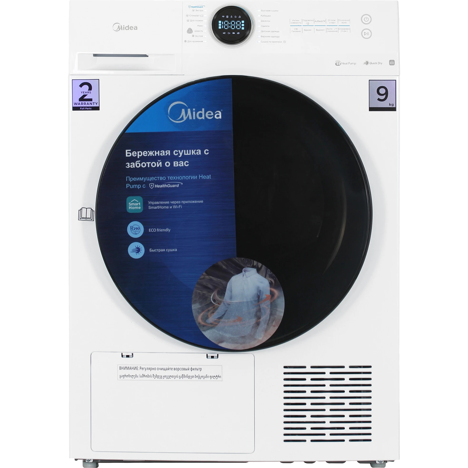 Сушильная машина MIDEA/ Сушильная машина MIDEA, отдельностоящая, загрузка 9 кг, 14 программ, поворотное/сенсорное управление, конденсационная сушка с тепловым насосом, Wi-Fi (SmartHome), отсрочка старта до 24 ч, датчик температуры, датчик влажности, автоматическое выключение, самодиагностика неисправностей, энергоэффективность А+++, цвет белый
