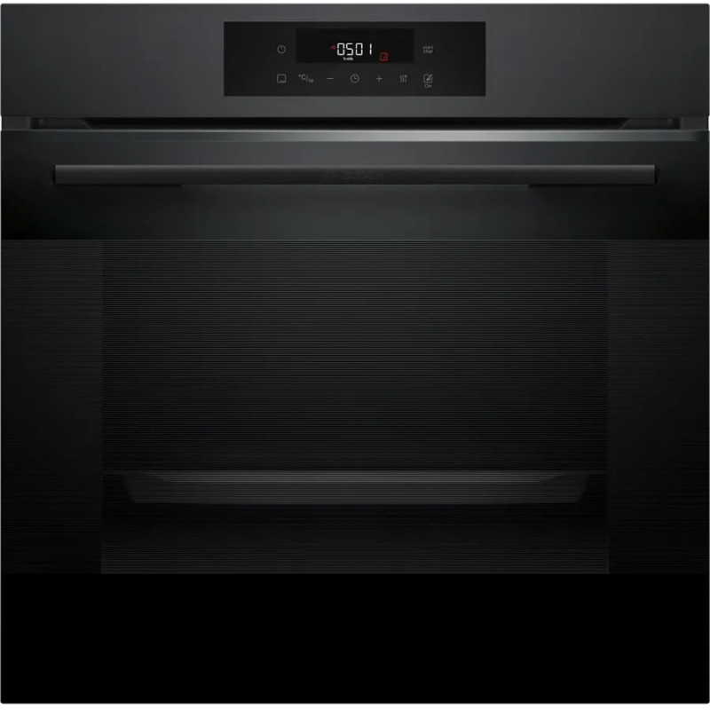 Электронное управление духового шкафа BOSCH Serie 6 HJG852YT0T с сенсорной панелью и цифровым дисплеем позволяет точно настраивать режимы работы, включая таймер, отложенный старт и автоматические программы.