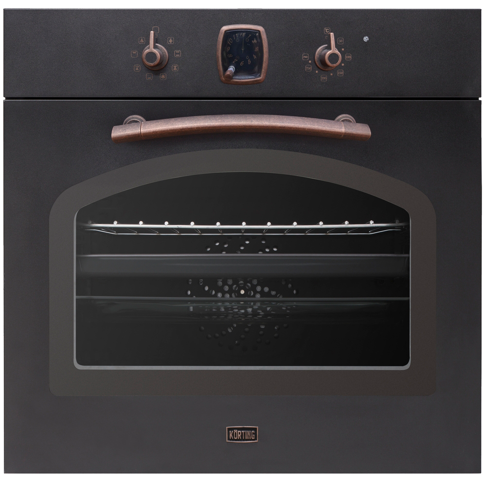 Встраиваемый духовой шкаф Korting/ Духовой шкаф в ретро-дизайне, аналоговые часы в классическом стиле Frank Muller с функцией времени, таймера и отключения, 8 режимов нагрева, объем духовки 64 л, телескопические направляющие на одном уровне, трехслойное остекление, каталитическая самоочистка, автоматическое отключение, в комплекте: глубокий противень, хромированная решетка, стеклянный противень, цвет - матовый черный; цвет ручек - медь