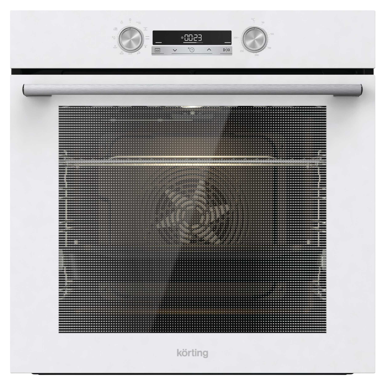 Встраиваемый духовой шкаф Korting/ Духовой шкаф с сенсорным управлением VISION LED, панель управления - стекло, LED дисплей белого цвета, 10 режимов, утапливаемые поворотные регуляторы, объем духовки 77 л, двухслойное остекление, каталитическая самоочистка, очистка камеры Steam cleaning, режим быстрого нагрева, функция "Гратен", автоматическое отключение, одноуровневые телескопические направляющие, эмаль легкой очистки, в комплекте: глубокий противень и хромированная решетка, цвет: белое стекло
