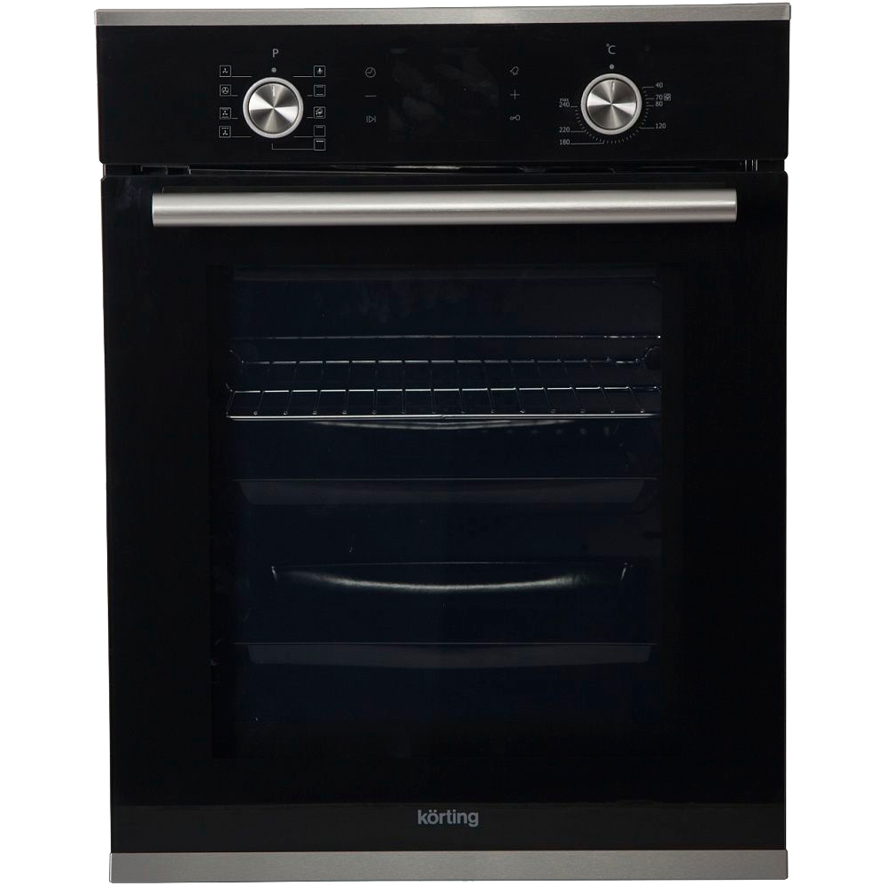 Встраиваемый духовой шкаф Korting/ Crystal, 59.6 х 45 x 55 см, 9 режимов нагрева, сенсорное электронное управление TouchControl, LED дисплей Cold White белого цвета, утапливаемые переключатели, телескопические направляющие на 1-м уровне, черное стекло