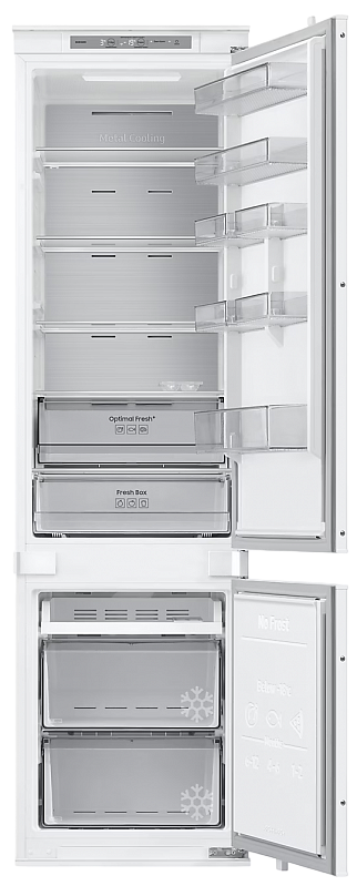 Встраиваемый холодильник Samsung, ВхШхГ 193.5х54х55 см, объем 298 (224+74) л, Twin Cooling, Metal Cooling, зона свежести, режим "Отпуск", No Frost, Wi-Fi, слайдерное крепление, энергоэффективность E