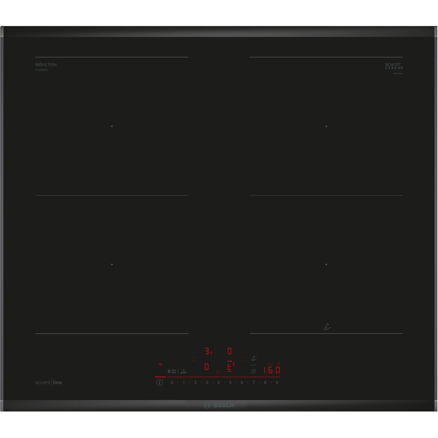 Serie 6, индукционная варочная поверхность, cтеклокерамика, AccentLine, черная, ширина 60см, 4 индукционных зоны нагрева, в т.ч. с возможностью объединения в 2 зоны CombiZone, сенсорное управление DirectSelect, распознавание наличия посуды, функция PowerBoost, таймеры прямого и обратного отсчета, функция MoveMode, Cleaning-пауза, индикация остаточного тепла, блокировка от детей, сделано в Испании