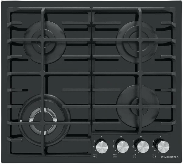 Встраиваемые газовые панели MAUNFELD/ Варочная панель, Газ, Газ на стекле, Габариты (ШхГхВ)мм: 590х515х51, механическое управление, 4 конфорки, мощность конфорок 1000, 1700, 1700, 3800, электроподжиг, газ-контроль, WOK, цвет черный