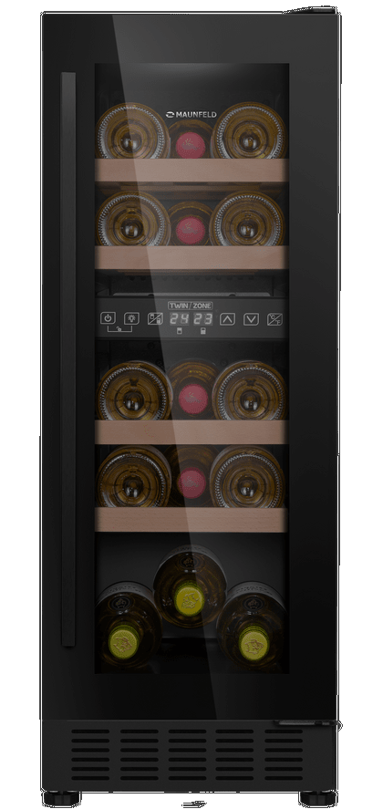 Винный шкаф MAUNFELD/ Винный шкаф MAUNFELD MBWC-56D17, ВхШхГ 820х295х613 мм, 17 бутылок, от 5 ° C до 22 ° C, отдельностоящий/встраиваемый, полезный объем 52 л, электронный термостат, диапазон влажности 50-80%, вентилятор распределения температуры, звуковой сигнал отключения питания, звуковой сигнал повышения температуры, сенсорное управление, энергоэффективность G, светодиодное освещение, стандартный компрессор, материал полок бук, R600A, цвет черный