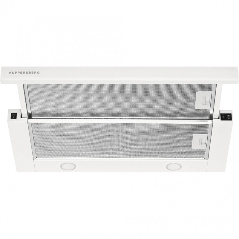Встраиваемая вытяжка Kuppersberg/ Встраиваемая телескопическая вытяжка, ширина 60 см, отвод/рециркуляция, 1500 м3/час, механическое управление, 3 скорости, освещение 2х2 Вт, металлические жироулавливающие фильтры, угольный фильтр KF-ES (опция), 63.4 дБ, обратный клапан, шхвхг:55.2x25.5x28см, цвет белый