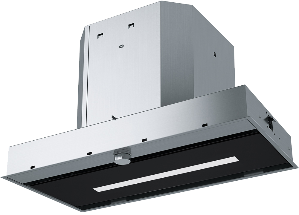Вытяжка встраиваемая в шкаф с панелью из черного стекла имеет подсветку, которая включается и выключается нажатием кнопки управления Push&Turn, а изменение мощности вытяжки осуществляется поворотом этой же кнопки вправо или влево.