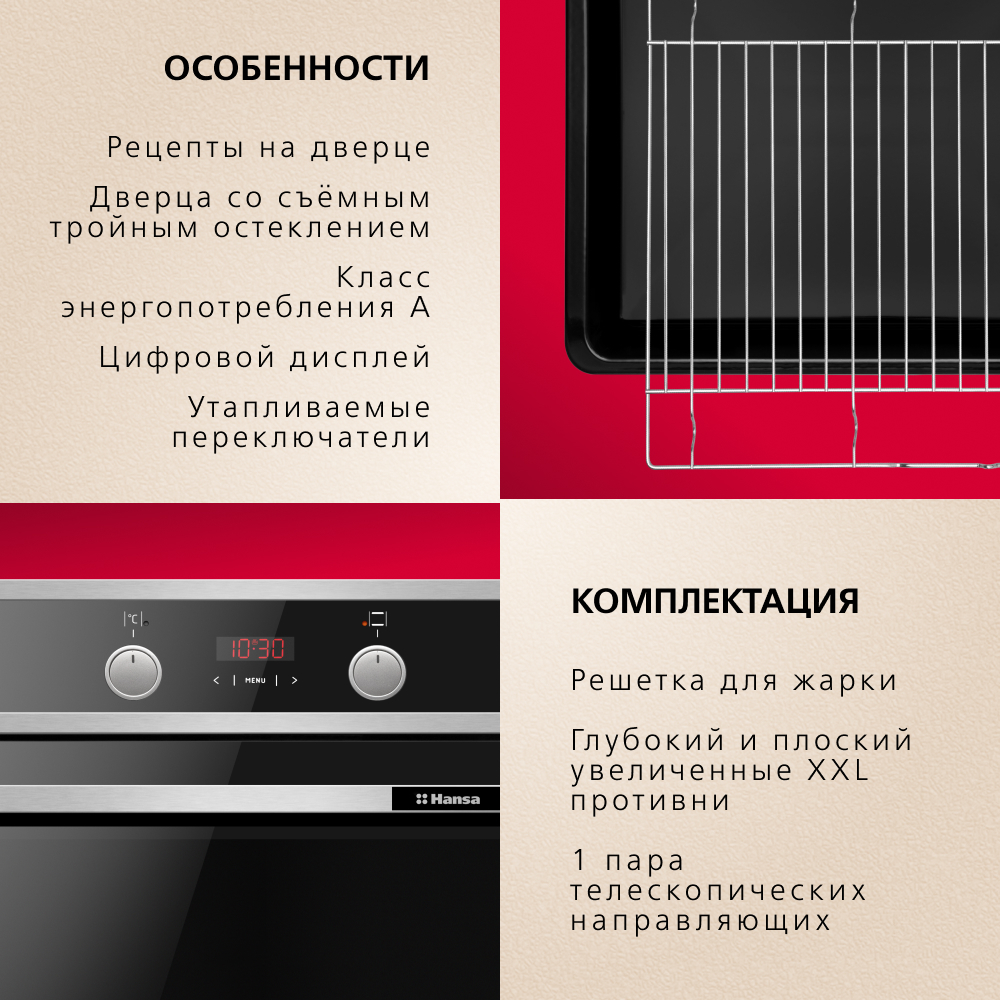 увеличенный объем 75 литров, 2 протвня большего размера, телескопические направляющие, 11 программ, рецепты на дверце