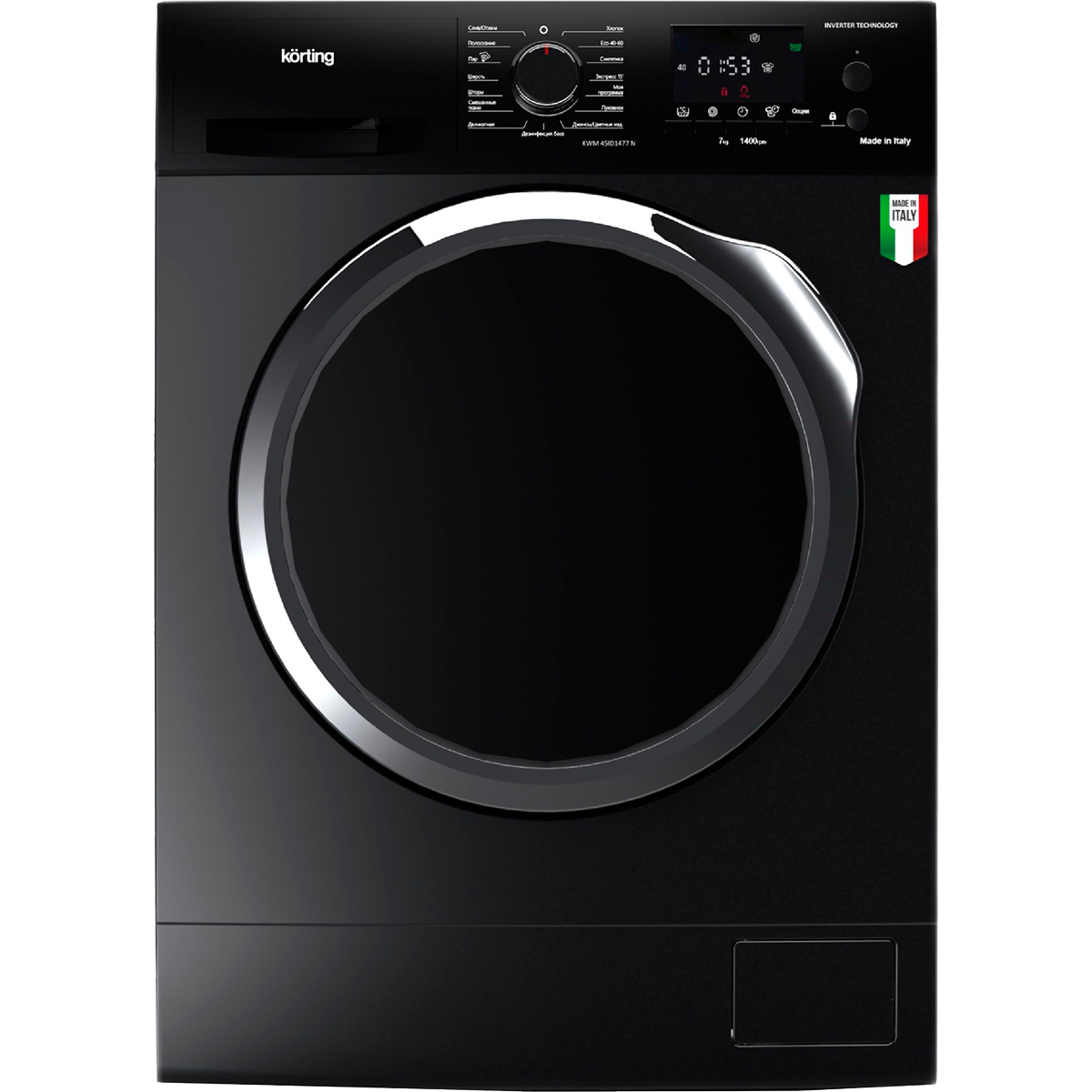 Стиральная машина KORTING/ Стиральная машина KORTING, отдельностоящая, глубина 45.5, инверторный мотор, загрузка 7 кг, 1400 об/мин, электронное управление, цифровой дисплей, 15 программ, отложенный старт, автоматическая блокировка дверцы/панели управления, контроль баланса барабана, энергоэффективность А, уровень шума 55-77 дБ, цвет черный