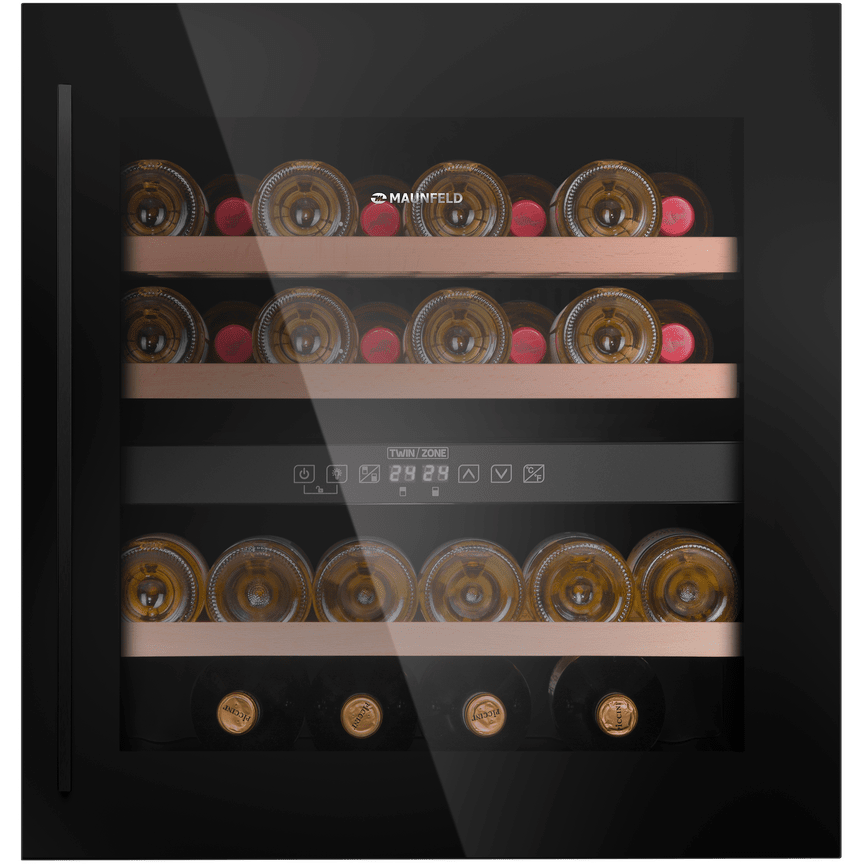 Встраиваемый винный шкаф MAUNFELD/ Винный шкаф встраиваемый MAUNFELD MBWC-92D36, ВхШхГ 595х590х563 мм, 36 бутылок, от 5 ° C до 22 ° C, полезный объем 85 л, электронный термостат, индикация температуры, звуковой сигнал отключения питания, звуковой сигнал повышения температуры, диапазон влажности 50-80%, вентилятор для распределения температуры, сенсорное управление, энергоэффективность G, стандартный компрессор, светодиодное освещение, материал полок бук, R600A, цвет черный