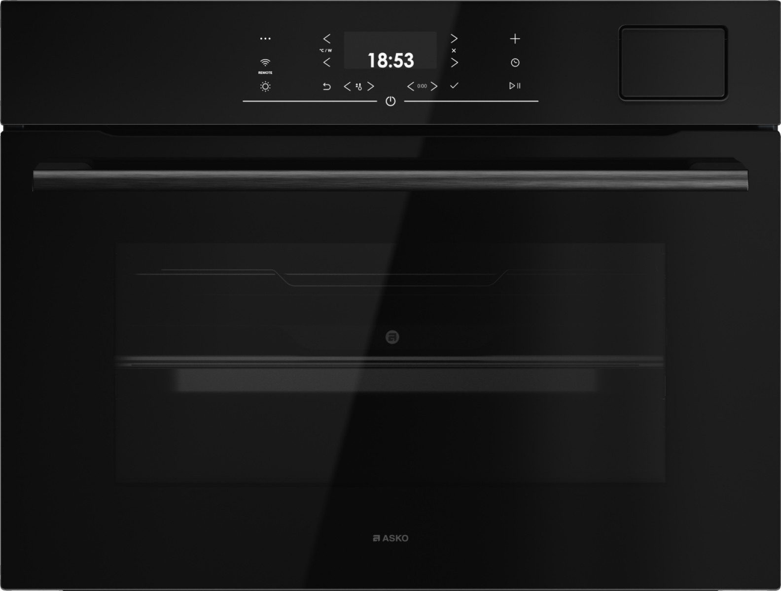 Встраиваемый духовой шкаф ASKO/ Арт. 745722 ПРОМО ; Встраиваемый духовой шкаф ASKO, компактный, 45 см, объем 51 л, TFT дисплей с сенсорными кнопками, 14 режимов приготовления, AirFry, 3 режима приготовления на пару, 123 автоматические программы, температурный диапазон 30-250 градусов, галогеновое освещение, телескопические направляющие (на 1 уровень), плавное открывание/закрывание, термозонд, Wi-Fi, цвет черное стекло