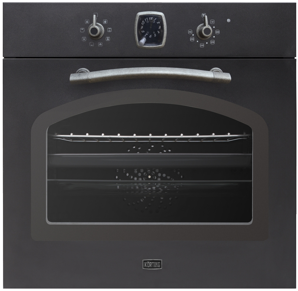 Встраиваемый духовой шкаф Korting/ Духовой шкаф в ретро-дизайне, аналоговые часы в классическом стиле Frank Muller с функцией времени, таймера и отключения, 8 режимов нагрева, объем духовки 64 л, телескопические направляющие на одном уровне, трехслойное остекление, каталитическая самоочистка, автоматическое отключение, в комплекте: глубокий противень, хромированная решетка, стеклянный противень, цвет - матовый черный; цвет ручек - состаренное серебро