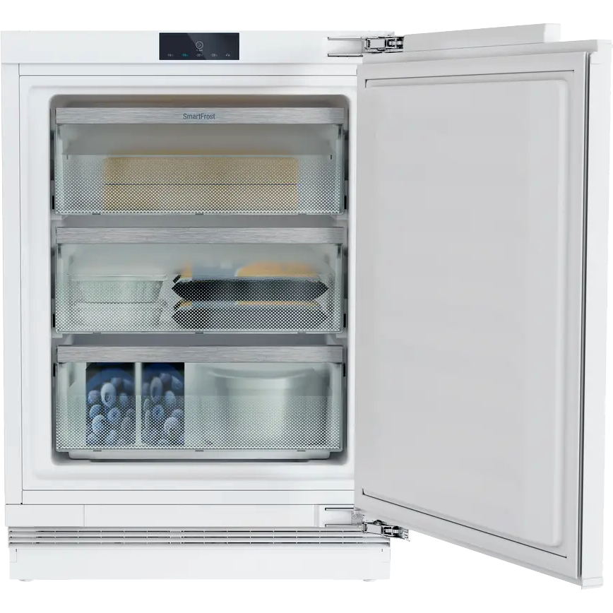 Морозильная камера Liebherr SUFc 3703-20 001 Pure – модель встраиваемого типа, может быть установлена под столешницу. Для монтажа требуется ниша размерами 86-92 х 60 х 56,0 см. Максимально возможный вес фасадной двери – 10 кг, угол открывания – 115°. Общий объем прибора составляет 94 л, мощность замораживание составляет 7,2 кг в сутки. Технология SmartFrost позволяет реже размораживать устройство.