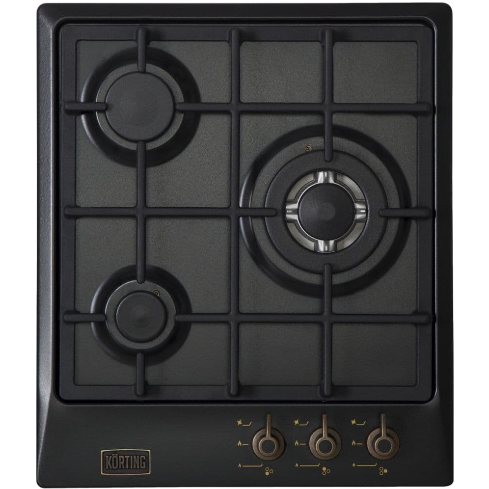 Встраиваемая варочная панель Korting/ Газ, Calabria, Газовая варочная панель шириной 45см в ретро-дизайне, 3 высокоэффективные конфорки, WOK- сверхмощная конфорка, автоматический электроподжиг, газ-контроль каждой конфорки, передние переключатели, чугунные решетки, цвет-черный, цвет ручек-бронза
