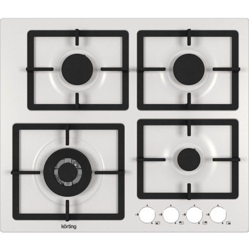Встраиваемая варочная панель Korting/ Газ, Crystal, 60x51 см, Газовая варочная панель 60 см, 4 высокоэффективные конфорки, WOK- сверхмощная конфорка с тройным рядом пламени, автоматический электроподжиг, газ-контроль каждой конфорки, передние металлические переключатели, утопленные чугунные решетки, в комплекте - чугунная подставка WOK и адаптер для кофейника, белая