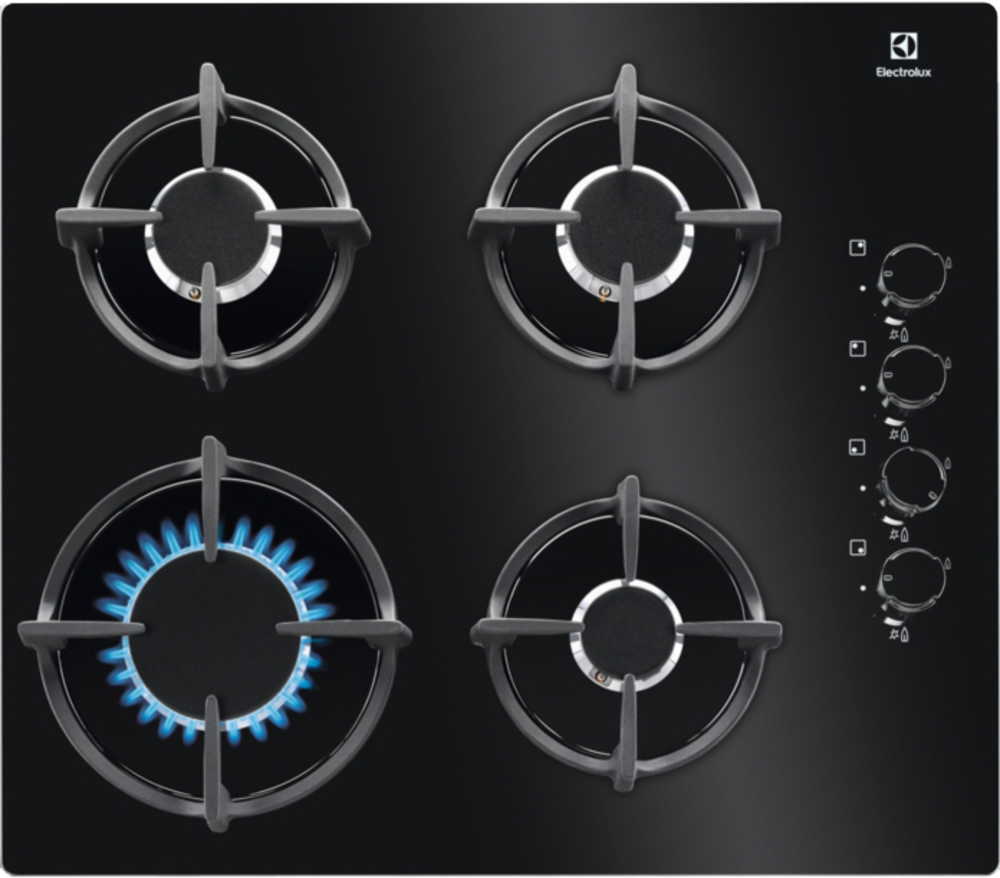 Встраиваемые газовые панели ELECTROLUX/ Газовая варочная поверхность, газ на стекле, 4 индивидуальных чугунных держателя, газконтроль варочной поверхности, интегрированный автоподжиг варочной поверхности, боковое управление
