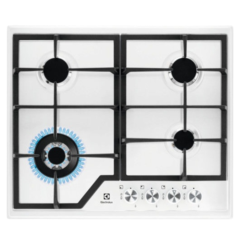 Встраиваемые газовые панели ELECTROLUX/ газовая на 4 конфорки, эмалированная сталь белого цвета, мощность: 8800 Вт, автоматический электроподжиг, газ-контроль, решетки: чугун, независимая установка, размеры (ШхГ): 59.5x51 см