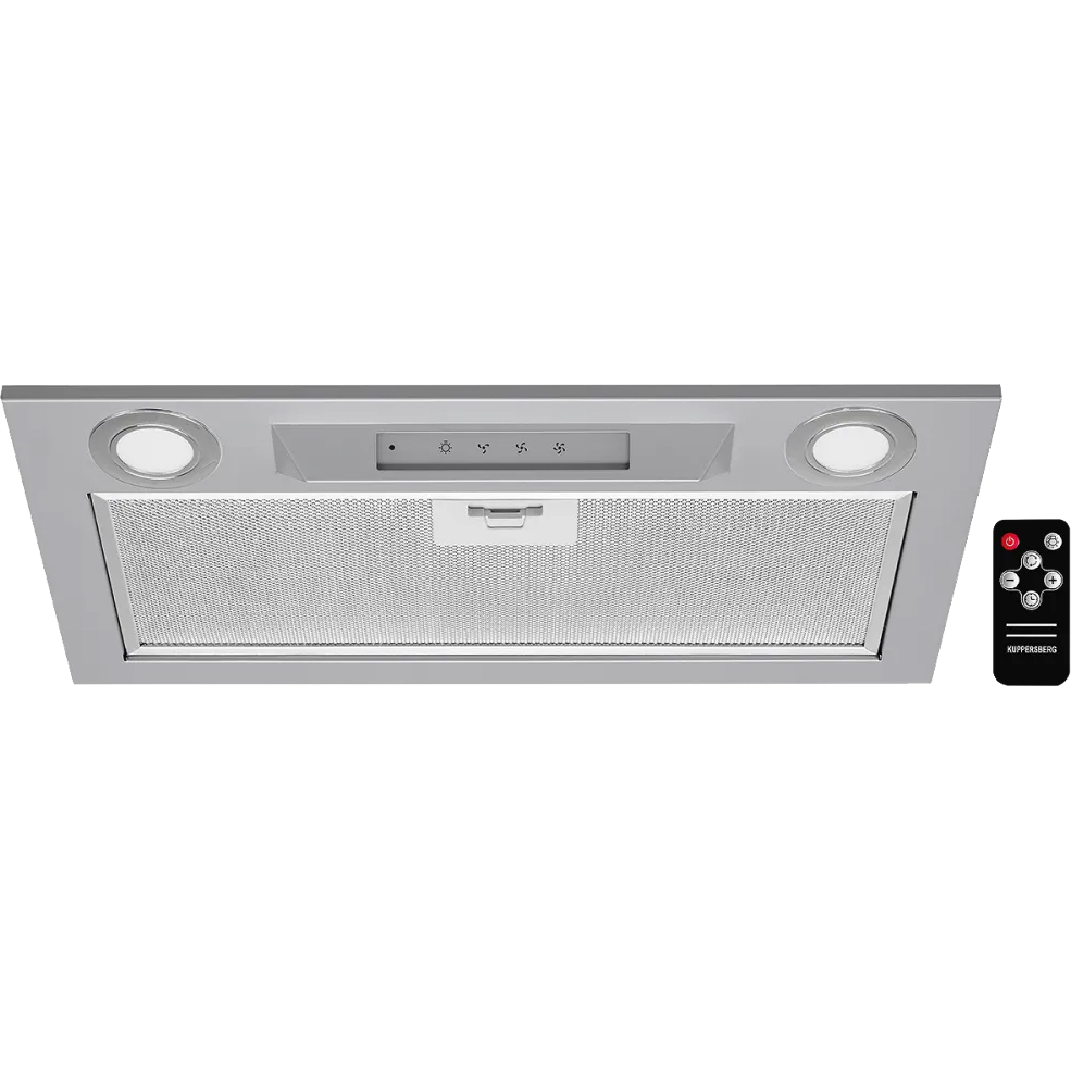 Вытяжка встраиваемая Kuppersberg/ Встраиваемая вытяжка, ширина 52 см, отвод/рециркуляция, 850 м3/час, электронное сенсорное управление, таймер, пульт ДУ, 3 скорости, светодиодное освещение 2х3,5 Вт, металлический жироулавливающий фильтр,угольный фильтр С6С (опция), 42 дБ, цвет нержавеющая сталь