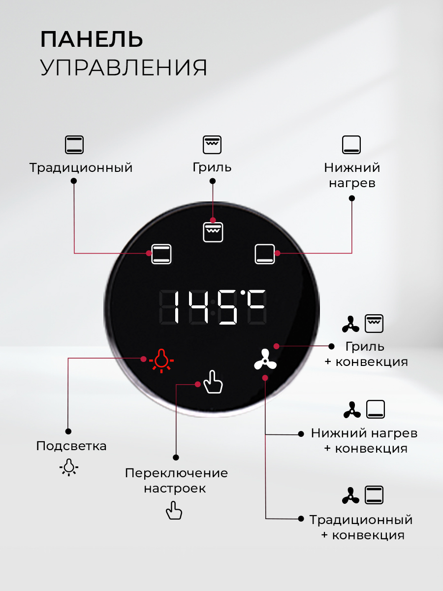 Гриль, Гриль с конвекцией, Нижний нагрев, Нижний нагрев с конвекцией, Подсветка, Традиционный, Традиционный нагрев + конвекция