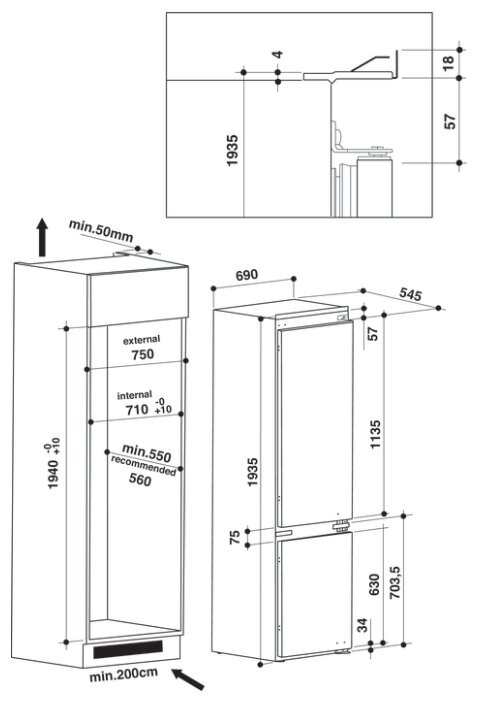 Размеры ниши для встраивания, ВхШхГ см 194x71x56